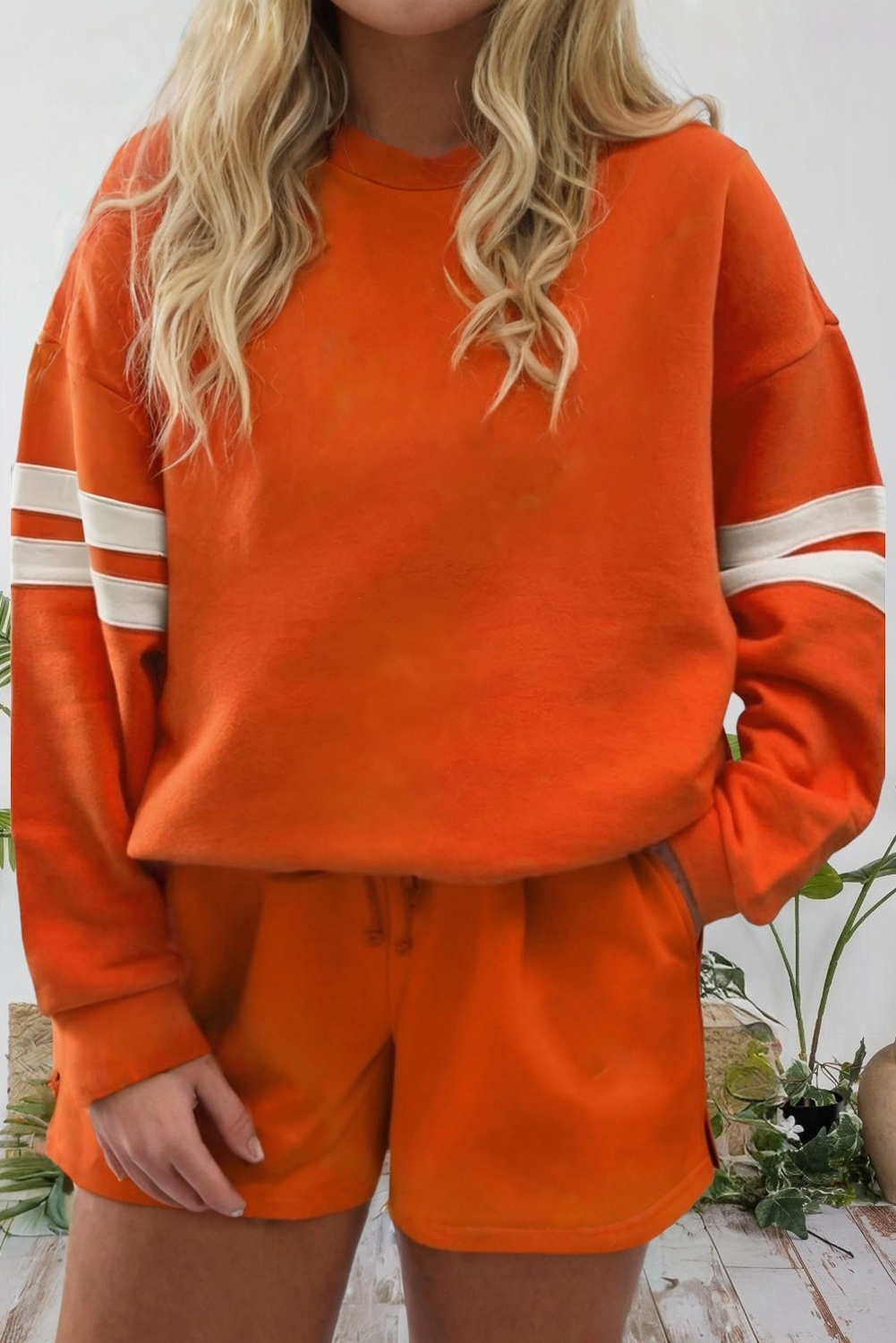 Orange Varsity Striped Sleeve Sweatshirt and Shorts Set