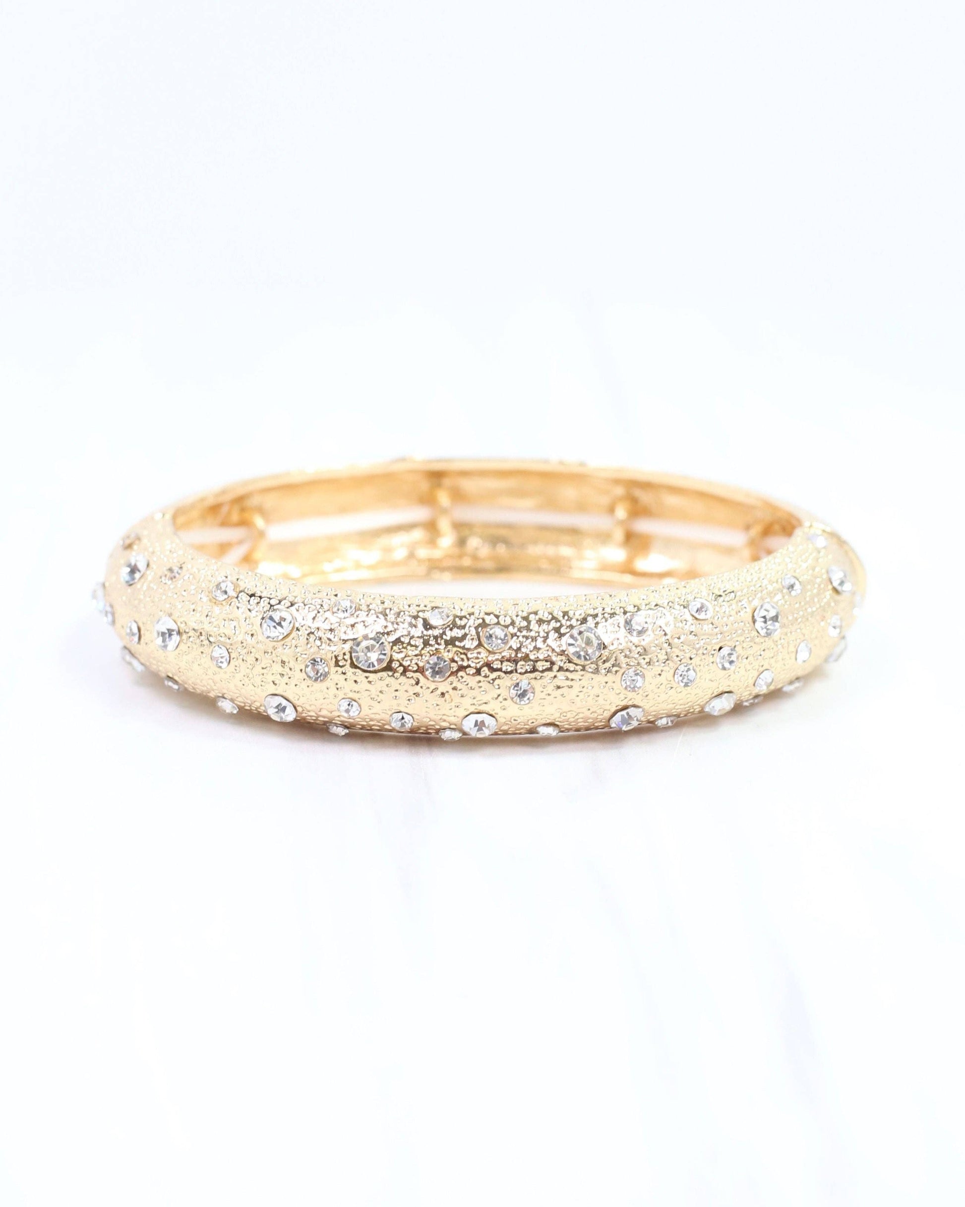 Elevate your style with the Danice Textured Gold Bracelet featuring delicate cz accents. This stretch bangle combines a unique textured gold finish with subtle clear stones for a chic, fashionable look. Its flexible design ensures a comfortable fit for most wrist sizes, making it a versatile accessory for any outfit.