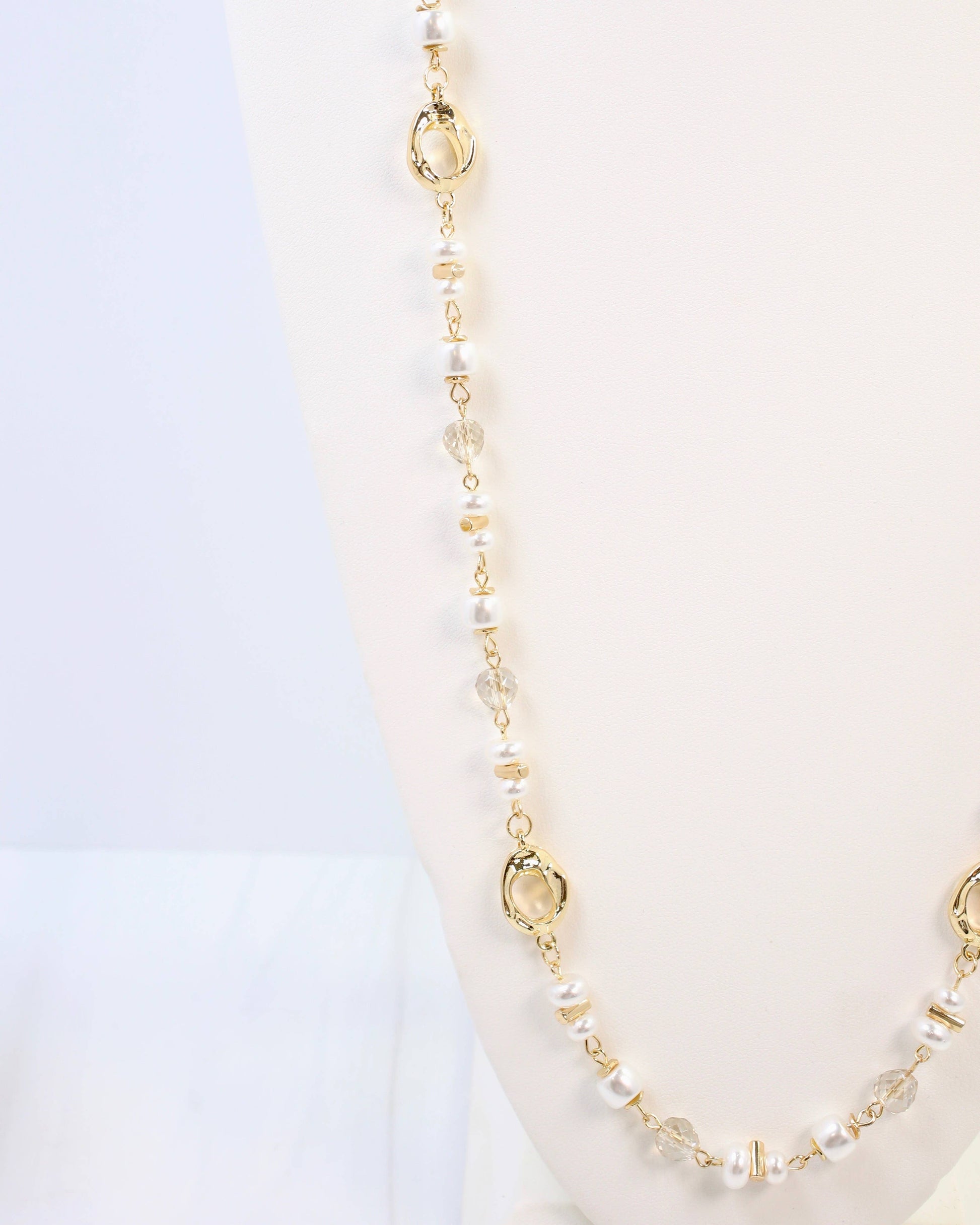 The Fairbanks Long Glass Beaded Necklace Pearl combines elegant pearls with gold oval beads, creating a fashionable accessory that adds a chic touch to any outfit. Its refined design makes it a versatile piece perfect for elevating your everyday look or complementing special occasions.