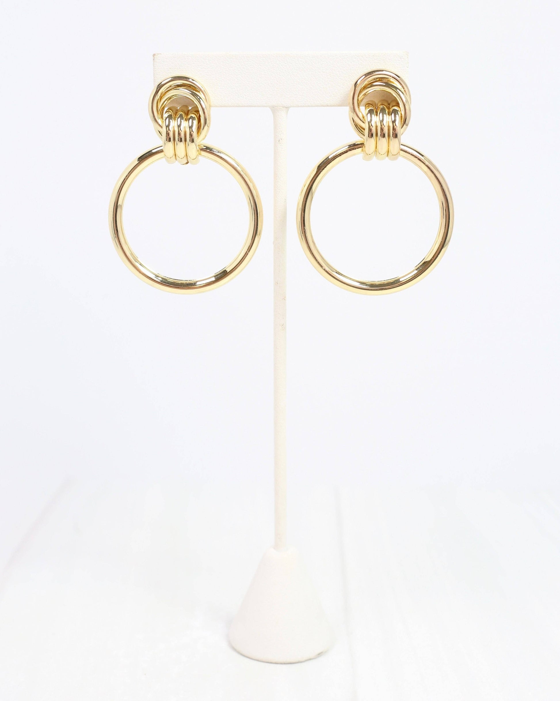 This shiny metal earring has an intertwined links post and an open circle drop accent. It has a vintage style design with a shiny metal finish.